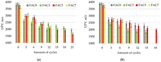 Thermal quenching can cause the formation of new cracks or propagation of the existing ones, leading to strength reduction. The formation of cracks significantly affects the velocity of ultrasonic wave propagation (UPV) through the material. UPV measuring helps to effectively track the extent of damage caused by the thermal shock [56]. Table 3 and Figure 7 show the change in UPV when the samples are subjected to thermal cycles. After three TSR cycles, the UPV decreased by about 20–30% in all samples due to the cracks formed. The lowest change in UPV was observed in composition FAC7, with the highest content of FACs. SEM analysis (Figure 3h) showed that at high FAC content, the particles agglomerate, and the cracks in the cement matrix between the cenospheres become wider and deeper.