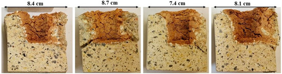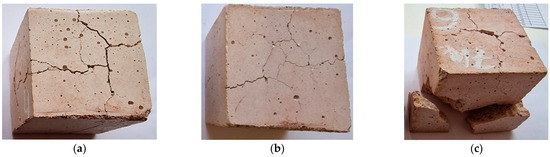 Irrespective of the fact that after 9 TSR cycles, FAC7 samples show the lowest decrease in UPV, deep cracks cause the samples to break up into large fragments and lose more than 30% of their weight (Figure 8c). The degradation pattern of reference samples without FACs was similar to that of samples FAC7 (Figure 8a). Samples FAC3 and FAC5 showed a higher decrease in UPV; however, the fragmentation of the material into smaller pieces was observed in sample FAC5 (Figure 8b). According to [58], the material with a high concentration of short microcracks will have high resistance to the propagation of long cracks and improved resistance to thermal shock. It is likely that at 3% and 5% FACs, the sufficiently even distribution of particles in the cement matrix inhibits the propagation of long cracks, thus forming a network of microcracks and leading to heterogenization and fragmentation of the structure, which helps the specimens to retain their shape for a longer time and to avoid degradation when exposed to TSR cycles.