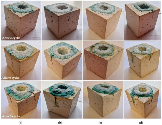 Images of the samples after 3, 6, and 9 cycles of alkali attack: (a) reference sample, (b) sample with 3% FACs, (c) sample with 5% FACs, (d) sample with 7% FACs.