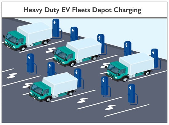 Many alternative solutions to the deployment of a greater number of EV charging stations for high-capacity needs are available, such as plug-in hybrid EVs (PHEVs). One significant possibility might be electrified roads (eRoads) and electric road systems (ERSs), which can provide a continuous power supply that enables EVs to maintain mobility for long-distance trips. ERS infrastructure is considered suitable for both trucks and cars because its utilization can overcome the challenges associated with the number of fast chargers required for accommodating all types of vehicles [2,3]. ERS infrastructure can reduce the need for large battery capacities in vehicles, thus resolving weight constraints and lowering GHG emissions, including those associated with battery materials. For heavy-duty vehicles, ERS and depot charging, which is illustrated in Figure 1, are the most cost-effective solutions early in the transition process, while public fast charging stations (FCSs) become increasingly feasible from a cost perspective as a larger share of truck traffic is electrified. A combination of ERS and fast charging infrastructure might be the most effective and fastest option for decarbonizing heavy-duty transport and rendering it more sustainable.