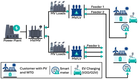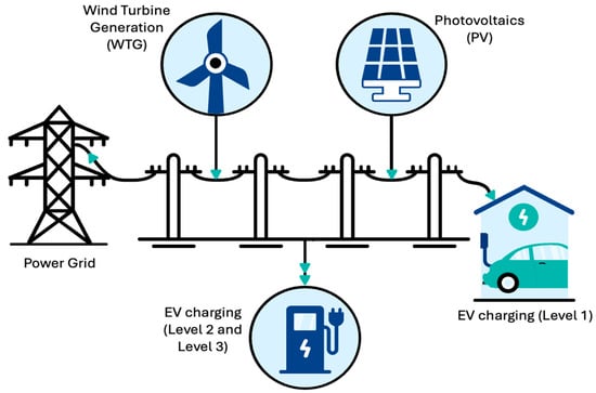 An additional consideration is the ongoing move toward increasing the penetration of sustainable renewable energy sources (RESs) to improve grid reliability and resilience. However, these energy sources also create numerous system challenges stemming from their intermittent nature [6,7]. With respect to REG and EV, intermittency has been effectively mitigated by significant advancements in battery technology, which have led to improvements in energy density, cost reduction, and expanded driving ranges [8]. However, core issues at the distribution level still include voltage drops and line losses due to EVCS-related sharp growth in power demand, and increasing numbers of EVs are further affecting DNs in terms of energy management, giving rise to concerns regarding EVs and power quality. Figure 2 illustrates the basic architecture of an active distribution network (ADN) characterized by REG and EVCSs.