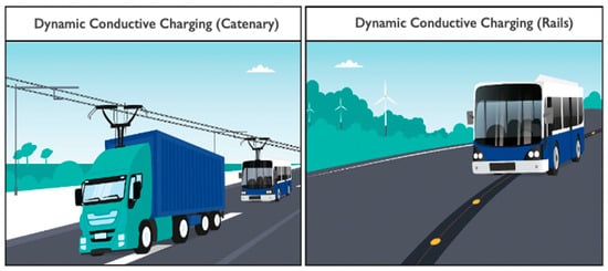 Dynamic conductive charging (DCC) is a type of charging that requires a physical connection between a vehicle and the power source while the vehicle is in motion. It enables continuous power supply and charging as a vehicle moves along a road. DCC involves two main charging methods. One is illustrated in Figure 4 and entails providing power to EVs through conductive elements embedded in roads or rails. To provide power, the second method requires the use of overhead catenary wires like those employed with electric trains and trams. DCC could potentially reduce the need for large battery capacities, and with proper charging control, it could decrease power demands on the grid during peak hours, when large numbers of heavy-duty vehicles are using the same infrastructure at the same time. However, a DCC charging strategy is used primarily for heavy-duty transport vehicles such as buses and trucks and is acknowledged to be less suitable for regular EVs.