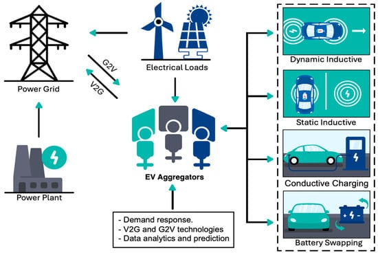 For EV charging schedules, the distribution network operator (DNO) can utilize EV aggregators to reduce losses and avoid voltage fluctuations. As depicted in Figure 6, each aggregator must coordinate charging procedures whereby each user can satisfy the lowest possible charging costs and shortest wait times [13,28]. However, this approach is data-intensive and becomes complex if multi-objectivity and multi-dimensionality trade-off solutions are considered.