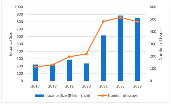 Green bond issuance trends in China (2017–2023). This figure shows the issuance size and volume of green bonds in China on an annual basis.