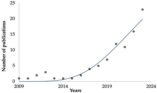 RQ1: What were the evolutions and changes in renewable energy and tourism research from 2008 to 2023? To evaluate trends in the number of publications, data were downloaded in CSV format and processed in Microsoft Excel. The rate of velocity (years−1) was determined through the Gompertz equation and the solver function according to methodology by [23]. The results of publications and the data generated by the Gompertz model were processed using regression curve fitting, which was complemented with statistical analysis with significance set at p = 0.05. The determination coefficient (R2) was calculated as well.
