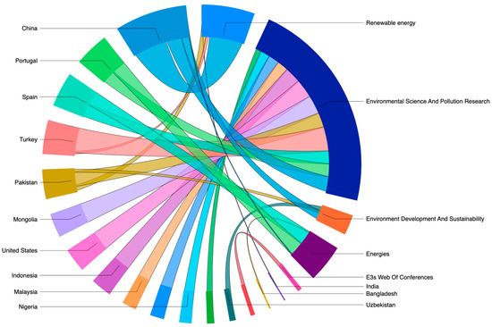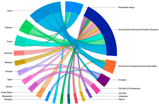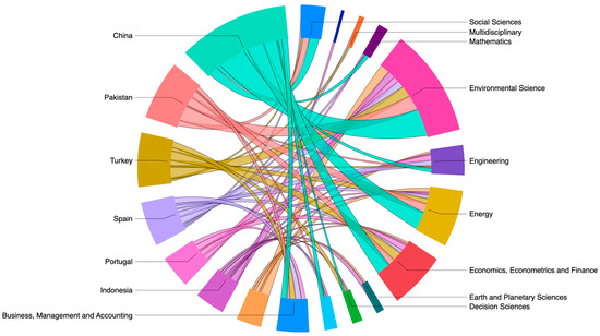 To obtain a clear picture of the distribution of publications across countries and subject areas, a chord diagram analysis was conducted, as illustrated in Figure 2. Chord diagrams provide visual representation in the form of a circle that interrelates data similar to a transition matrix [28]. Considering the volume of publications, China is the country with the highest ranking in the subject areas of “Environmental Science”, “Engineering”, “Energy”, “Economics, Econometrics, and Finance”, and “Business, Management, and Accounting”. Together with China, Pakistan, Turkey, Spain, and Portugal, these countries comprise the top five of this indicator.