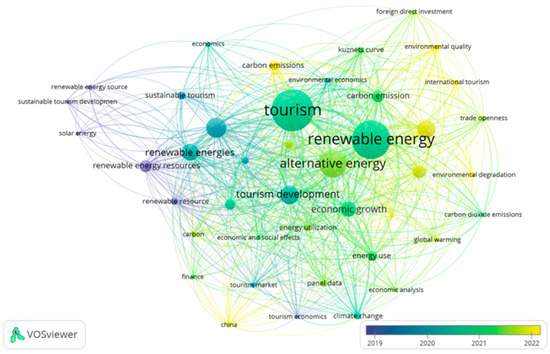 The overlay visualization function of VOSviewer was employed to analyze the evolution of keywords over time, in the period from 2020 to 2023 (Figure 6). It was observed that the keyword “economic” was incorporated in the authors’ publications, complementing the topic of renewable energy and tourism. This phenomenon may be attributed to the commercial imperative of tourism, in conjunction with the environmental awareness developed in recent years by society.