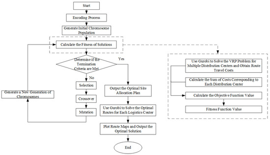 The location and route optimization model of cold chain logistics centers involved in this study is a typical NP-hard problem, characterized by high complexity and computational load. To address this, we propose an innovative hybrid optimization method that combines an improved genetic algorithm with the Gurobi solver, effectively seeking optimal objective function values. This method primarily uses a genetic algorithm to solve location allocation problems, while leveraging the Gurobi solver for route arrangement during the evaluation process of each generation of solutions. The algorithm flow chart is shown in Figure 1.