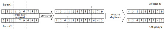- Crossover operator:The crossover operator used in this study aims to generate superior individuals by merging genetic information from two different individuals. The crossover operation involves the number of distribution centers, the selected centers, and their served customer nodes. It is based on OX crossover and further improved [32], with specific operations, as shown in Figure 3.
