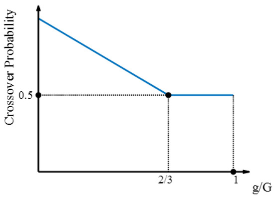 The crossover probability determines the frequency of crossover operations. A high probability may lead to the destruction of good genes, while a low probability may result in local optimization. This paper uses an adaptive crossover probability to balance genetic diversity and preserve good genes, as shown in Equation (42).where represents the crossover probability, is the maximum crossover probability (set to 1), is the minimum crossover probability (set to 0.5), g is the current iteration number, and G is the total number of iterations. The function graph is shown in Figure 4.