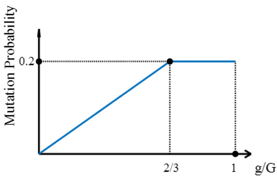 Figure 5. Mutation probability.Analysis of Figure 5 shows that the mutation probability is kept at a lower level initially to avoid excessive randomness and is appropriately increased in the later stages of evolution to explore a broader solution space and prevent premature convergence.