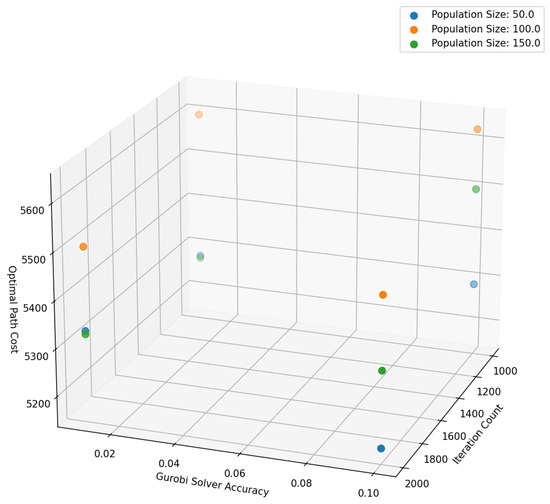 To comprehensively compare the effects of different genetic algorithm parameter settings and Gurobi solver accuracies on optimal routing costs, we varied the population size (50, 100, and 150) and iteration counts (1000 and 2000) and considered Gurobi solver accuracies of 0.01 and 0.1. To effectively avoid algorithm convergence to local optima, dynamic crossover and mutation probabilities were uniformly applied in parameter adjustments. Figure 6 clearly illustrates the significant impact of these parameter settings on total costs. In the figure, to emphasize hierarchy, circles were intentionally designed with lighter colors toward the inner edge and darker colors toward the outer edge.