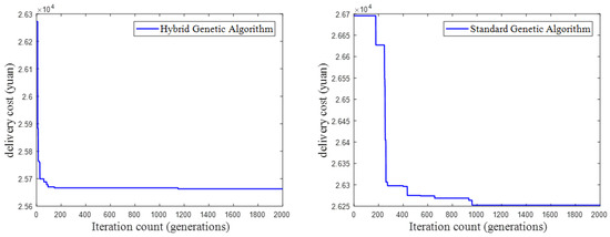 Comparisons of the optimal values of the objective function and the convergence curves for the standard genetic algorithm and the improved genetic algorithm are shown in Figure 7.