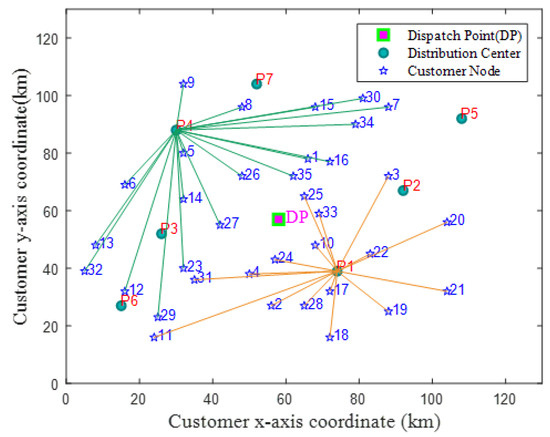 In this section, we use Matlab and Gurobi to allocate and plan routes for the optimal distribution centers in the health resort area, resulting in Figure 8. The final location result is the dispatch point serving 35 terminal customers in the area through distribution centers 1 and 4.