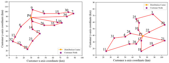 Further optimizing the routes with Gurobi, the optimal routes for distribution center 1 and distribution center 4 are obtained as shown in Figure 9.