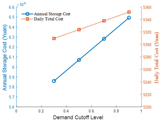 With other parameters unchanged, the impact of different demand-cutting levels () on storage costs is shown in Figure 10. The results show that with the increase in , storage costs and total costs show a linear upward trend, reflecting a proportional relationship between costs and demand under fixed location selection.