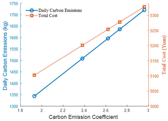 With other parameters unchanged, further analysis under different carbon emission coefficients is shown in Figure 11. It is found that carbon emissions and total costs increase with the increase in the carbon emission coefficient. Therefore, the use of energy-saving vehicles can effectively reduce carbon emissions and total costs.