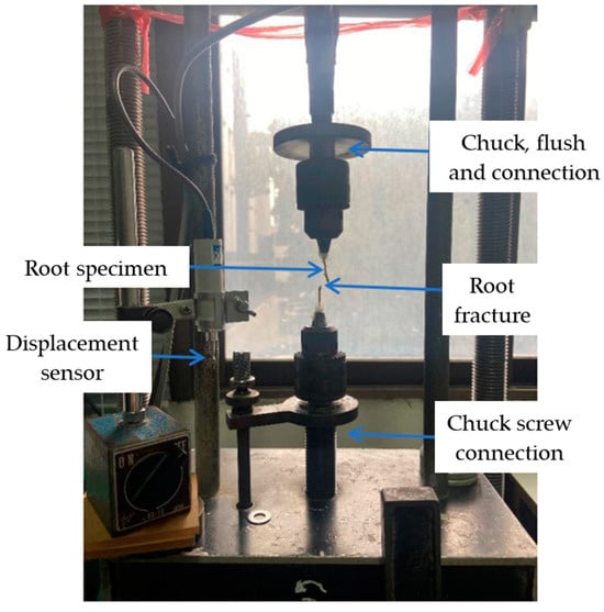 After excavation and washing, the root specimens were placed in sealed plastic bags, transferred to the laboratory, and stored in a refrigerator at 8 °C. Subsequently, all specimens were tested at ambient temperature in the moisture condition they retained post-sampling. This condition is hereafter referred to as as-sampled moisture condition. However, for Cinnamomum officinarum, additional series of tensile strength tests were carried out on root specimens that had been dried for 7 days in order to explore the effects of drying. In the tensile strength test, the root specimen was gripped using a drill-bit clamp connected to a load cell, and tension was applied using a loading frame at a constant speed of 4 mm/min []. To ensure secure gripping of fine roots, a customized gripping mechanism was employed, utilizing two chuck grips at the ends of the root. Epoxy resin or latex glue was applied to reinforce up to 5 mm at the root ends to prevent squeezing and pulling out during testing, and sometimes a rubber membrane and gauze cloth were also used between the root and the grip to avoid stress concentrations and improve the grip. After reinforcement of root ends (within 30 min), specimens were subjected to testing, with the root segment length between clamps set at 50 mm. Only test results of specimens with ruptures occurring near the middle part were considered reliable and included in the data analysis. In the case of any slippage, the tensile test was discarded. Figure 1 shows the complete assembly of the tensile testing machine used in this study. The root tensile strength (MPa) at maximum load and Young’s modulus (MPa) were obtained from the stress–strain curve of the tested sample []. The tensile strength (Tr) at maximum load was calculated using Equation (1).