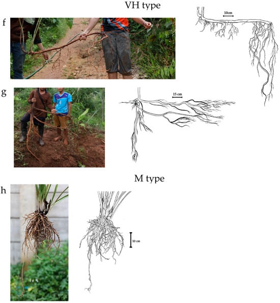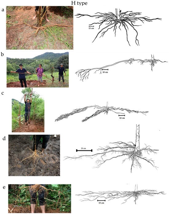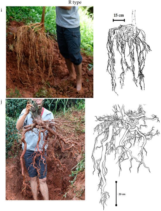 Morphological shapes of plant roots: H type (a) Gliricidia sepium, (b) Persea americana, (c) Fraxinus griffithii, (d) Coffea arabica, and (e) Buddleja asiatica; VH type (f) Macaranga denticulata and (g) Cinnamomum officinarum; M type (h) Aspidistra sutepensis; R type (i) Cajanus cajan and (j) Camellia sinensis.