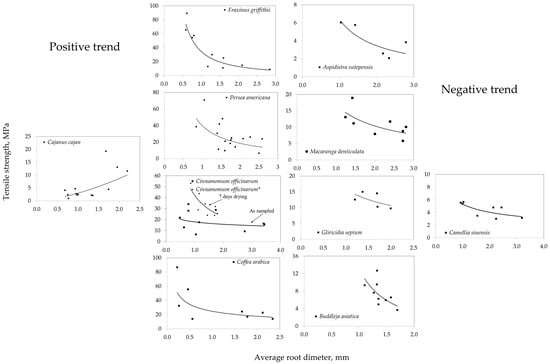 - The root tensile strength and Young’s modulus–diameter relationships of the ten species highlighted two different trends. For nine of the species tested, P. americana, F. griffithii, M. denticulata, G. sepium, A. sutepensis, C. arabica, C. sinensis, C. officinarum, and B. asiatica demonstrated a decrease in tensile strength with the diameter, the commonly observed negative power law relationship with the exponent values ranging from −0.187 to −1.983. Conversely, C. cajan exhibited an increase in tensile strength with the diameter, the positive power law with the exponent value of 1.5474 diverging from the typical trend.