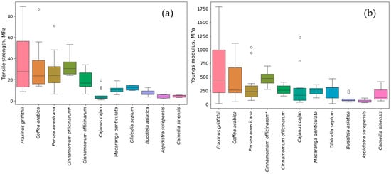 Boxplots of root tensile strength (a) and Young’s modulus (b) tested species for different species. The bottom and top of the boxes represent the 25th and 75th percentiles, respectively, while the line within the box marks the median and the circle represents outlier (Cinnamomum officinarum* refers to 7-day drying condition).