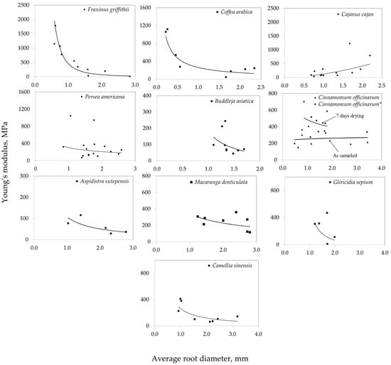 Young’s modulus versus root diameter for the 10 species tested (Cinnamomum officinarum* refers to 7-day drying condition).