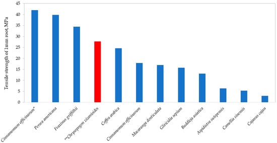 Root tensile strengths of 1 mm diameter root size of the studied species (blue bars), including data of **Chrysopogon zizanioides (red bar) from Mahannopkul and Jotisankasa [] for comparison (Cinnamomum officinarum* refers to 7-day drying condition; other cases referred to as as-sampled moisture condition).
