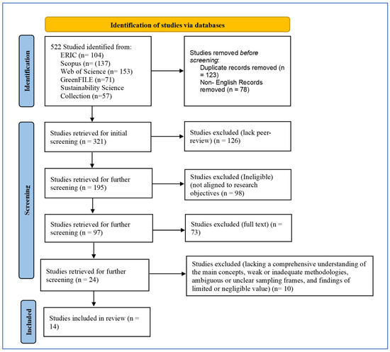 Through utilising the CASP checklist [15] as a guiding framework, a systematic and thorough evaluation of each article’s strengths and weaknesses across these four key quality indicators was ensured. This approach led to the selection of a final collection of fourteen high-quality research articles that formed the foundation for the comprehensive review of data privacy considerations in sustainable educational data analytics for postgraduate education. Leveraging the PRISMA framework, Figure 1 maps the comprehensive search strategy and rigorous selection process implemented to identify pertinent studies for this systematic review.