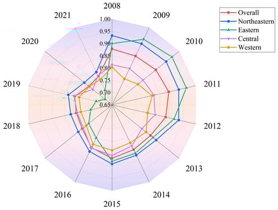 Dynamic evolution of carbon emission efficiency within national high-tech zones: (a) overall, (b) eastern, (c) northeastern, (d) central, and (e) western.