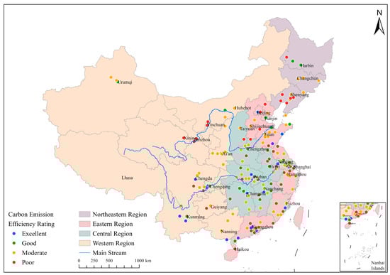 To better represent the spatial distribution of carbon emission efficiency within national high-tech zones, this study ranked the efficiency of carbon emissions within all high-tech zones. The carbon emission efficiency is divided into four stages: if the average value is not less than 1, it is rated as “Excellent”; between 0.9 and 1, it is rated as “Good”; between 0.7 and 0.9, it is rated as “Moderate”; and for values below 0.7, as “Poor”. The geographical distribution and carbon emission efficiency ratings of national high-tech zones are shown in Figure 2. The average carbon emission efficiency score and carbon emission efficiency rating of national high-tech zones can be found in Appendix A.