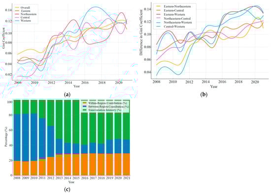 (a) Overall and within-region Gini coefficients, (b) between-region Gini coefficients, and (c) spatial variations and contribution rates of carbon emission efficiency in national high-tech zones.