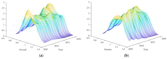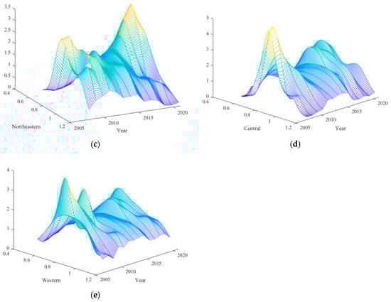 In terms of the primary peak’s shape, the principal peak in the kernel density curve inside the high-tech zones at a national level grows in height while expanding in width. The alterations observed in the eastern and northeastern areas mirror the general pattern, indicating that more observations are concentrated within a lower range of carbon emission efficiency, while internal differences are gradually increasing. In contrast, in the central and western areas, the height of the major peak decreases as the width expands, indicating that carbon emission efficiency data are spread throughout a larger range. This indicates significant differences, an uneven efficiency level, and an internal presentation of diversity and dispersion.