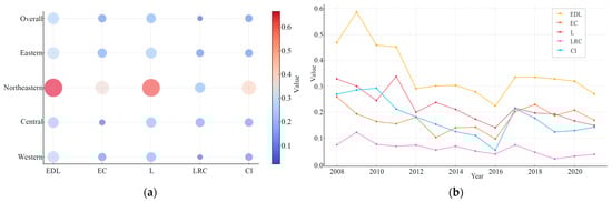 The determination q values and significance levels of each driving component obtained by the geographic detector (see Table 5) are utilized to thoroughly examine the endogenous variables influencing the spatiotemporal development of carbon emission efficiency. Figure 5a shows that industrial output value is the primary intrinsic factor influencing carbon emission efficiency, with its impact on high-tech zones and the four major regions significantly higher than other factors. On the one hand, a high industrial output value usually indicates higher production activity, which may entail greater resource consumption and environmental pressure. On the other hand, it may also reflect higher levels of technology and efficiency, thereby improving resource utilization and carbon emission efficiency. In high-tech zones as a whole, labor and capital inputs are secondary elements impacting carbon emission efficiency, but land resource utilization is also important. The situation in the eastern and western areas is comparable, although carbon emissions in the eastern region are more heavily influenced by land resource utilization. Labor is a minor driving component in the northeastern area, but capital input and energy consumption have a considerable impact on carbon emissions. The central region exhibits a multifactor endogenous constraint, where, aside from the level of economic development, the determinant power of other driving factors shows relatively small differences.