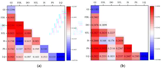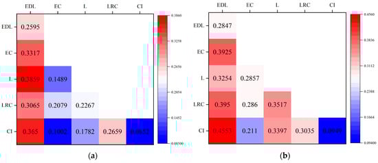 The interaction detector compares the values of separate components to the aggregate value acquired by spatial overlay to identify the degree and direction of the interaction. This evaluation aids in understanding whether the interaction affects the explanatory power of a single variable or affects the geographical heterogeneity of the dependent variable. If , the interaction between and is classified as non-linear weakening. If , it is classified as single-factor non-linear weakening. If , it is considered dual-factor enhancement. If , then variables are independent of one another. If , the interaction has been characterized as non-linear enhancement.