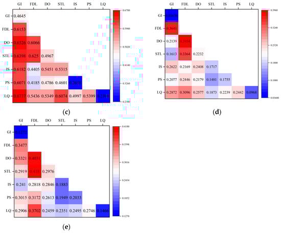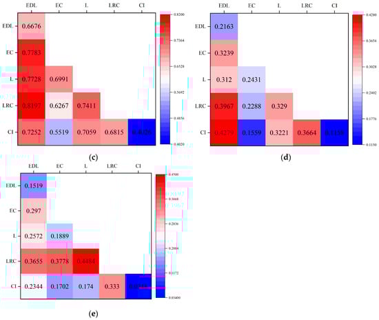 Interaction detection results of endogenous driving factors: (a) overall, (b) eastern, (c) northeastern, (d) central, and (e) western.