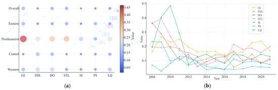 Figure 3a depicts how the overall and area Gini coefficients for carbon emission efficiency vary among national high-tech zones. The mean overall Gini coefficient registers at 0.91, signifying a considerable spatial disparity in carbon emission efficiency. Throughout the study period, the total Gini coefficient grew from 0.0576 to 0.1183, showing that the carbon emission efficiency gap between high-tech zones has increasingly broadened. Between 2008 and 2010, the overall Gini coefficient experienced a downward fluctuation before steadily increasing on a yearly basis. When the four primary areas are compared, it is clear that carbon emission efficiency varies across high-tech zones: the western region has the most internal disparities, with an average intra-regional Gini coefficient of 0.0914. This is followed by the northeastern, eastern, and central areas, which have average intra-regional Gini coefficients of 0.0847, 0.0804, and 0.0778. The Gini coefficient in the eastern region follows a trend similar to the overall Gini coefficient, first fluctuating downward and then steadily increasing. In the central region, the Gini coefficient exhibits more frequent fluctuations, displaying a W-shaped pattern with “fall-rise-fall-rise”. The northeastern region has an N-shaped pattern with “rise-fall-rise” in its Gini coefficient, while the western region demonstrates an inverted U-shaped trend of “rise-fall”.