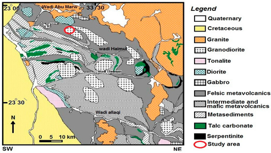 - El-Ramly, M.F.; Akaad, M.K. The Basement Complex in the Central Eastern Desert, between Latitudes 24 30′and 25 40′. Geol. Surv. Cairo 1960, 8, 35. [Google Scholar]