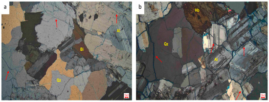 - Microscopically, the granodiorite exhibits boundary and transgranular cracks; however, boundary cracking is the main form of failure under thermal loading. Also, the impact of quartz on granodiorite thermal degradation is significant. Thus, most boundary cracks disperse at the quartz’s borders. After being heated and cooled, granodiorite experiences many transgranular cracks at 600 °C; most occur in quartz;