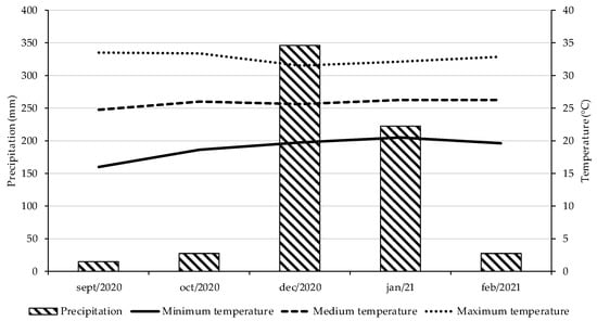 An experiment was carried out in southeastern Brazil (22°42′ S, 47°18′ W, and 570 m altitude) on a Red-Yellow Argisol (Ultisol) [9]. According to Köppen’s classification, the local climate is Aw type, which stands for a rainy tropical forest with rains in the summer and drought in the winter [10]. Figure 1 shows the data regarding the climate. During the experimental period, soybeans intercropped with tropical grasses were grown in the summer season.