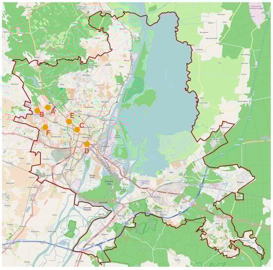 Location of playgrounds selected for analysis. A—Playground at Zawadzki housing estate, B—Playground in the Krzekowo-Bezrzecze housing estate, C—Playground on Zgody Square, D—Playground on Dworcowa Street, E—Playground in Telesfor Badetko Square, F—in the Gen. T. Kutrzeba park. Source: author’s work based on OpenStreetMap location map of Szczecin, https://upload.wikimedia.org/wikipedia/commons/thumb/3/34/Szczecin_location_map.png/1043px-Szczecin_location_map.png (accessed on 2 May 2024).