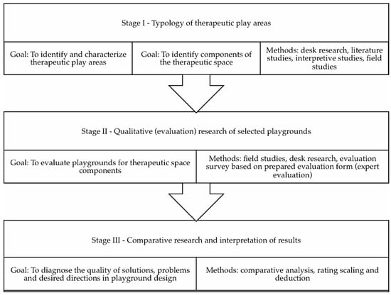 In stage one of the research, the primary method was interpretive research based on desk research (including literature studies and a review of the implementation of contemporary playgrounds) and field studies, which were used to identify different types of therapeutic playgrounds. The literature studies provided the necessary theoretical foundation at this stage for identifying different types of therapeutic playgrounds. Field studies and analysis of playgrounds selected as representing a specific type of activity were aimed at identifying the components of therapeutic space. It was assumed that the components of therapeutic space represent a kind of ideological basis for the therapeutic action of the space, and their action is conditioned by the presence of certain solutions and development elements.