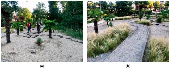 Playgrounds based on active therapy are most often garden-like spaces located next to hospitals and other health facilities, which allow children to reduce post-treatment stress, distract them from pain, and reduce their sense of fear. Their management depends on the specifics of the patients and the needs of their treatment and recovery. These spaces are distinguished by a functional program that considers not only passive but also active therapy, carried out in the form of various games such as creative, motor, or manipulative, with a structured or free-form character. The garden character of the space, the abundance of vegetation, colors, materials, and textures help to create the impression of an interesting but safe, often “familia” space, encouraging exploration. Typically, these spaces provide a range of interiors with varying degrees of openness, both intimate and calming, as well as more open and inclusive, which fosters a sense of security, taming the “situation”, and building confidence and mental balance. Playgrounds based on active therapy are often implemented in the form of so-called sensory playgrounds or sensory play gardens for children—playgrounds of a mostly garden nature, which are designed to stimulate specific senses and provide a variety of sensory experiences that support learning and development. The method of sensory integration therapy, usually conducted in therapeutic facilities, involves synchronizing the sensory systems, i.e., visual, auditory, sensory, and vestibular (otherwise known as the sense of balance). Developing sensory integration on the playground is possible through children’s contact with diverse surfaces, as well as playing on equipment. Standard playgrounds based on motor play equipment generally develop only motor skills but do not support the development of senses such as hearing, touch, and sight, which are essential for harmonious development. Sensory playgrounds, through the use of color contrasts and a variety of textures and textures in the materials and plant species used, as well as specially selected elements and equipment to stimulate play that activates specific senses (e.g., sensory paths, music panels, whiteboard equipment developing logical thinking skills, shape, color and texture recognition, sand and water play equipment, etc.) have a positive impact on various spheres of child development, enabling its integrated development. Sensory playgrounds can be located both at health facilities, e.g., in the form of meditation gardens, and in public spaces as public playgrounds and gardens (Figure 4a,b).