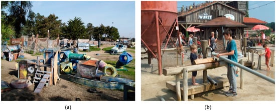 The therapeutic value of playgrounds based on the idea of space creation derives its potential from construction and creative play, primarily building play. A model example of space realizing them is an adventure playground—a self-created space using available materials and tools, as well as its variations such as a playground in a box—a playground with specially designed blocks, or a nature playground—a naturalistic version of adventure playground, and even edible playgrounds and edible schoolyard, which enable space creation through self-created plants. The adventure playground, as a place based on building play, is primarily a place for construction and creative play. Construction play develops praxis, or motor planning, and improves small motor skills. While playing construction games, the child can feel his power to make things. This positively influences the development of his sense of self-worth. Unfortunately, the adventure playground, despite the spread of the idea, especially in Scandinavian and Western European countries, does not find acceptance and understanding everywhere. Responsible for this are economic (the need to replenish materials, the appropriate size of the space, or the presence of animators) and aesthetic (the lack of acceptance of the “junk” aesthetics and the lack of permanent design). Moreover, the 1980s and 1990s brought the progressive standardization of playgrounds associated with the introduction of safety regulations (the first safety standards for playgrounds were published in 1981 by the U.S Consumer Product Safety Commission) and the use of computers and CAD tools in the design process. Custom-designed equipment and alternative playgrounds like the adventure playground were practically eliminated from the landscape. However, the idea of building play has found a continuation in the much more urban-compatible concept of imagination playground based on the use of specially designed lightweight modular play blocks, which work well both outdoors and indoors. All forms of playgrounds based on the idea of self-creation of space, in addition to the structural play, can also stimulate exploratory and theme play, as well as exercise social skills, problem solving, making choices, and cooperation, which makes them places with therapeutic effect not only through building a sense of agency but also good group functioning (Figure 5a,b).