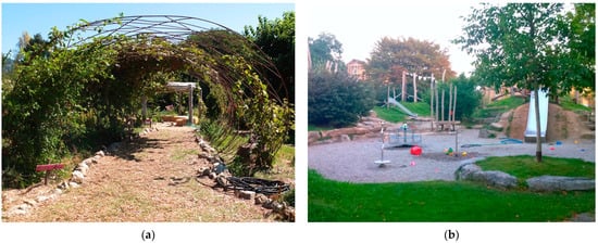 Nature-based playgrounds are generally a type of play environment and complex play spaces, where natural materials, features, and plants combine with creative forms of terrain to provide a wealth of play and activity forms. They most often come in the form of nature playgrounds but can also be implemented as garden forms of playgrounds such as children’s healing gardens, edible schoolyards, or children’s farms. Each nature playground is unique, as they are designed to fit the context of the site, and the local landscape. Traditional playground equipment can be found in their development, but they are always integrated into the surrounding landscape, fused with the landform, and surrounded by vegetation. The therapeutic nature of these spaces comes directly from contact with nature, the world of plants and animals, as well as from the variety of stimuli, opportunities for creative and constructive play, and even conducting organized horticultural therapy. Biophilia-based playgrounds are characterized by a therapeutic effect resulting not only from passive contact with nature. In general, these spaces provide opportunities for independent space shaping through gardening and arranging a small garden or creative and constructive play, which are stimulated by the generally high availability of loose parts and natural elements. In addition to building a sense of ability and providing manual exercise, gardening play, like construction play, teaches cooperation and collaboration (Figure 6a,b).