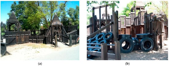 The idea of community action-based playgrounds is based on the belief that a playground can be a kind of cornerstone of the local community, reflecting the personality of its residents and creating a kind of physical and mental community platform for children and adults. Their therapeutic potential stems from the inclusive nature of the space, which is created through the joint action of the local community, inclusive and unifying around a common goal. This type of space is represented by a community-built playground—a type of participatory playground built by and according to the idea of the local community. Such a playground may resemble a traditional playground with equipment made of wood. However, as a rule, there are also original elements, which give the space an individual character. The possibilities for stimulating specific forms of play and integrative activities after the completion of the playground depend on the specific solutions adopted by the community. The most important value of the space, in this case, is the inclusiveness of the place, which is created during the process of establishment. A joint venture unites, and the community built based on joint work constitutes permanent social capital, the symbol of which becomes the playground (Figure 7a,b).