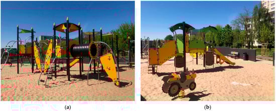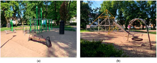 Playground A, located in the green area of the Zawadzki housing estate, is an example of a modern playground of the classic variety. Its development includes a dozen or so typical motor play equipment, more or less functionally complex, such as trampolines, linarium, multifunctional equipment with slides, and a system of platforms. The equipment was located on a sand surface without any divisions into activity zones. The whole area has been fenced, which makes the playground functionally and visually isolated from the surrounding green area. This limits the functioning of the playground strictly to a separate place with predetermined types of activity. Both the selection of equipment oriented strictly to physical activity and the way the space is arranged give very limited possibilities for using the playground as a therapeutic place. There are also concerns about the color scheme of the equipment, as the black color can evoke negative feelings and associations, and, moreover, can cause excessive heating of the equipment and surfaces. Unfortunately, the site is not protected from the sun in any way. In addition, the space is characterized by limited accessibility due to the type of surface used. The entire playground was covered with a sandy surface, which does not allow for use by people in wheelchairs and with limited mobility. The limited amount of seating and the lack of a separate seating and equipment-free zone severely limit the playground’s multifunctionality, its use by different age groups of users, and the possibilities for flexible use of the play space (Figure 9a,b).