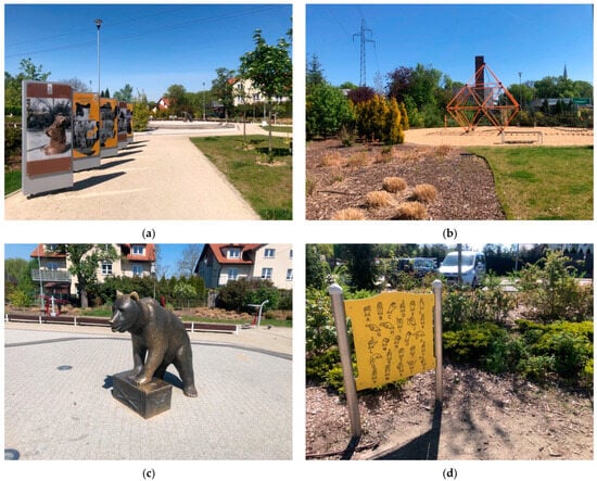 Playground B, located in the Krzekowo-Bezrzecze housing estate, represents an educational and family-themed playground with a clear ideological theme and an extensive functional program, connecting different age groups. The leitmotif of the playground is the figure of Wojtek Bear, who, together with the soldiers of the Anders Army, walked the entire combat trail, including through Monte Cassino during World War II. Functional zones and landscaping elements have been carefully composed and subordinated to the bear’s story. A sculpture of Wojtek Bear was placed in the central part of the square, which can be climbed, and educational boards telling his story were placed in the entrance area. In addition, the functional program includes a trampoline zone, a linarium zone, a zone for younger children with a “stork’s nest” swing and a merry-go-round, touch panels, a gym, rest and observation areas, and zones of composed vegetation. The premise gives the impression of a coherently and carefully composed space, offering choices in terms of forms of play and the nature of activities. The space is characterized by accessibility and inclusiveness—the development elements allow families to spend time together and people of all ages and fitness levels to use it. An added value of the space is its sensory qualities resulting from the variety of plant species and materials (Figure 10a,d).