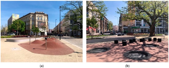 Playground C, located in the very center of the city on Zgody Square as part of the reconstruction of Wojska Polskiego Avenue, represents a street version of the modern playground, being part of the public space. As part of the investment carried out, the revitalized Agreement Square has become a kind of square with play as its leitmotif. This fits in with the concepts of a playable city and a children-friendly city, which promote solutions that tame urban space by introducing play into it. Among the functional zones and development elements are a trampoline zone, a hill zone with telephone play equipment, a swing zone, rest, and observation areas, and composed vegetation. The space is a kind of urban leisure oasis, offering a choice of forms and types of activity. There is room for both quiet rest and observation as well as more active forms of play, including those encouraging cooperation and interaction in and with the space. This is a result of providing a certain amount of sensory experience, resulting from the variety of plant species, materials, and textures, as well as the terrain. The square is characterized by a lack of urban barriers and inclusiveness, influenced by flexibility in the use of space (Figure 11a,b). Unfortunately, although there are large trees in the plaza, part of it is devoid of any protection from the sun, which may limit use on hot days.