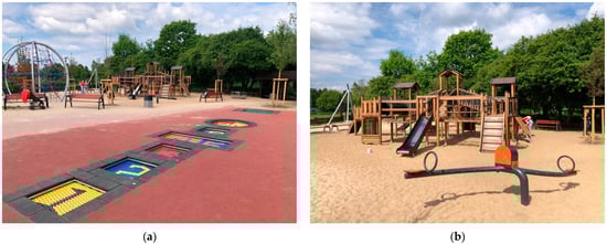 Playgrounds based on active therapy: sensory playground in Swinoujscie—a sand zone (a), sensory playground in Swinoujscie—a sensory path (b). Source: author’s work.