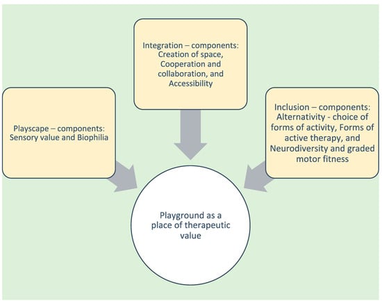 The indicated components in the listed types of therapeutic playgrounds occur in various configurations, often acting synergistically with each other. Some of them have a priority action—crucial for a given type of place and defining its way of functioning, while others have a supportive action, acting synergistically with the priority components, or supplementary, when they are not essential, and their presence causes an expansion of the program (Table 2). The presence of the identified components of therapeuticity in the playground through the use of specific solutions in the space creates the conditions for realizing the therapeutic potential of the playground.
